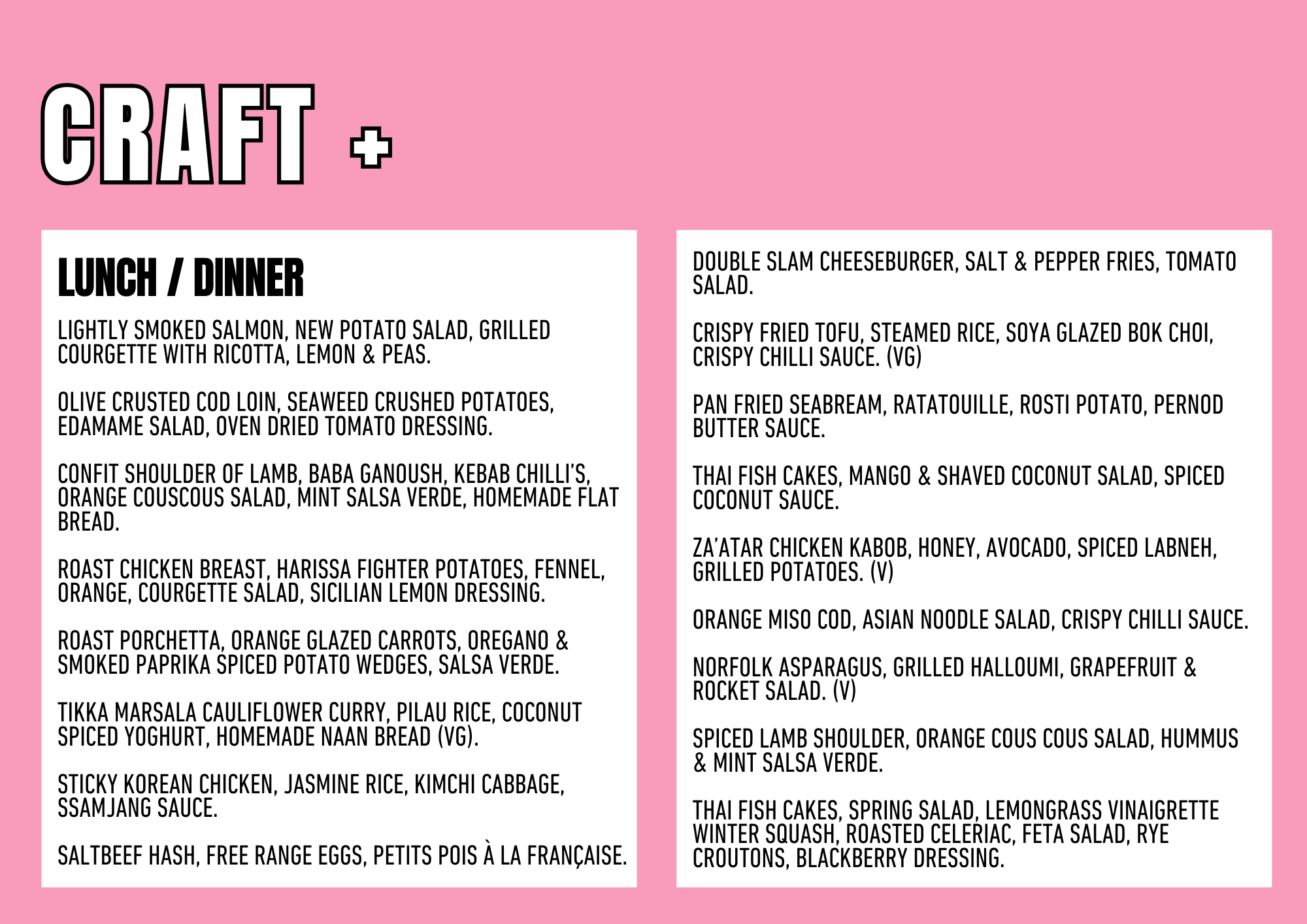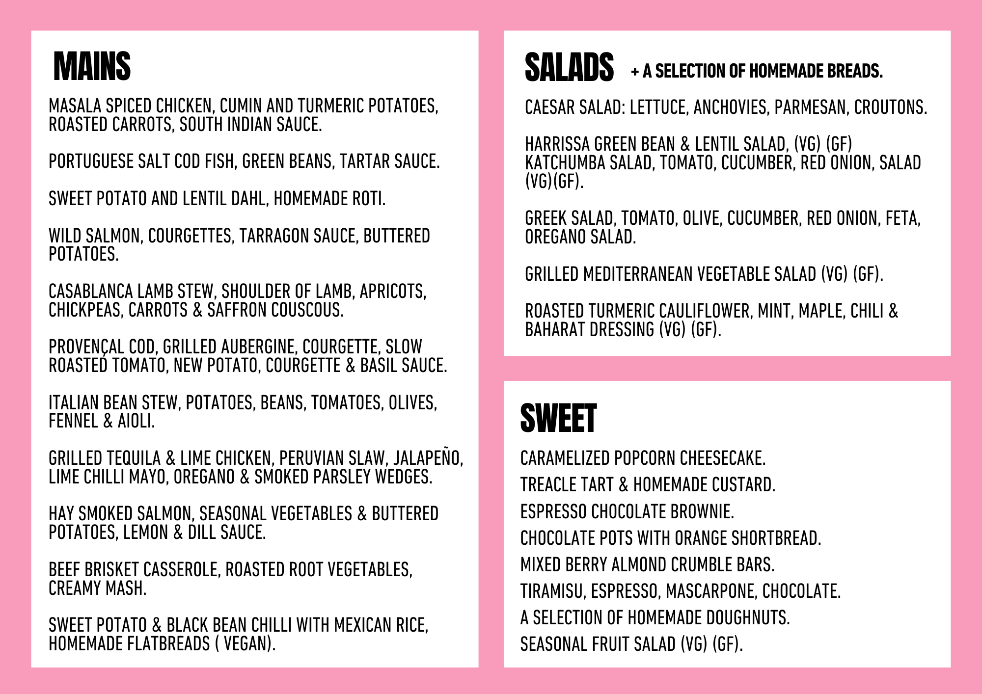 Our menus are bespoke, bold, and memorable. We’re experienced at serving a range of delicious foods, specialising in TV, Film and Media catering, and weddings, including big breakfasts, brunch, hot ‘n hearty meals, lunch, dinner, healthy options, and salad bowls – plus treats, snacks and creative Craft offerings. We can always work with your ideas to create something spot-on! Scroll through, and tap on our sample menus below to explore just some of our options.